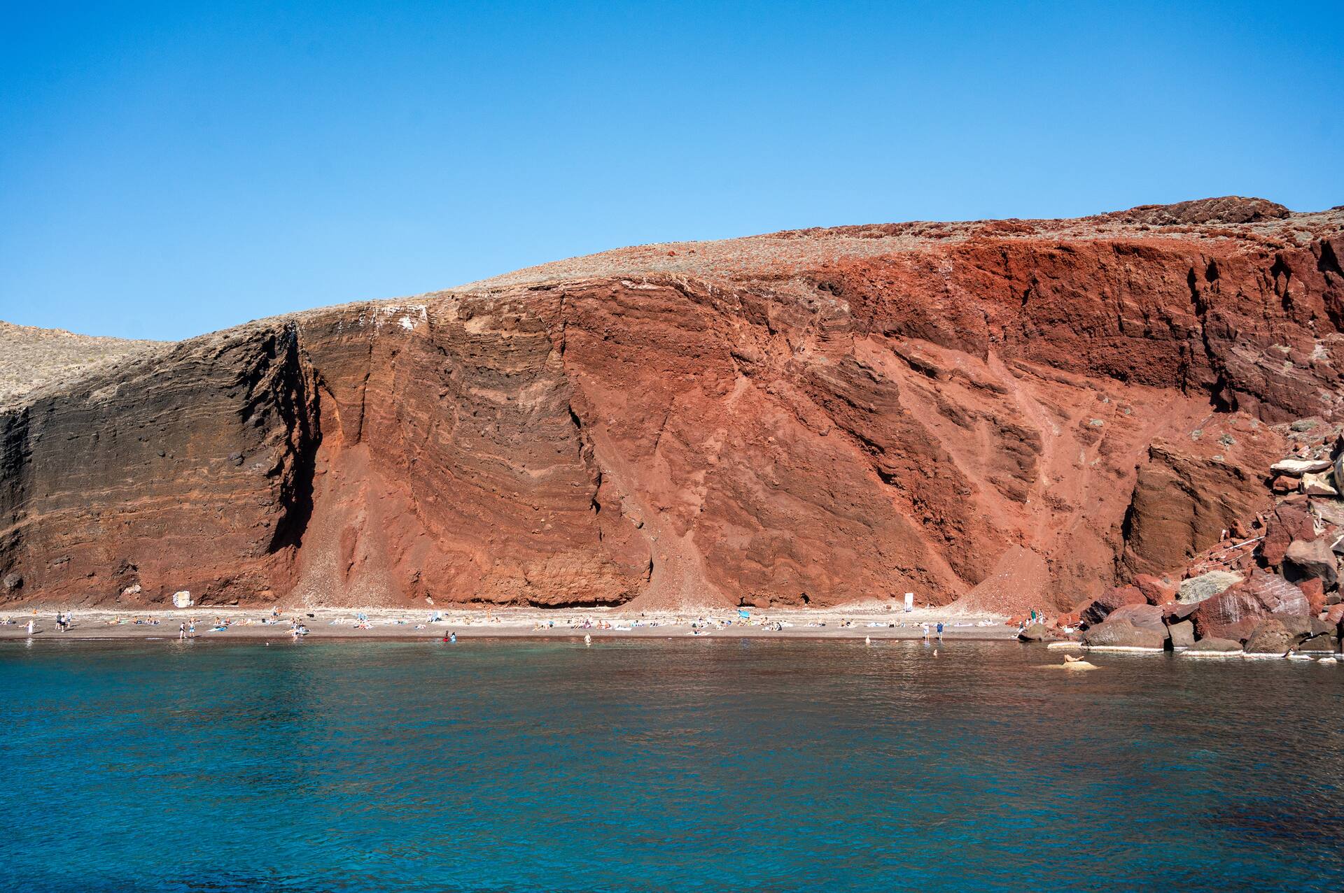 Setting sail from Vlychada Marina and cruising along the coastline, we arrive at Akrotiri’s Red Beach, admired for its distinct red hue, caused by the rich in volcanic minerals soil. Next, we sail towards the White Beach. Then we sail towards Mesa Pigadia for a swim break. Snorkeling gear and towels are provided to all our guests. Later, we pass the Lighthouse and enter the Caldera for a unique view of the whole bay. Our sailing route includes a close sail by the volcano crater and a full view of it. Our next stop is at the Hot Springs. This is where our second swim break takes place in the sulfurous waters that provide a natural spa. With the breathtaking views of Thirassia Island as a backdrop matching the picturesque Village of Oia, your Santorini Sailing experience shall culminate in the most unique and unforgettable way possible.